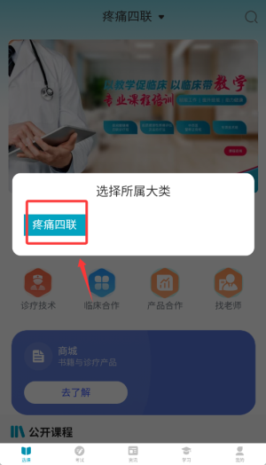 1、进入疼痛四联APP后,在知识库中选择对应的病症分类,如骨科或神经科等。