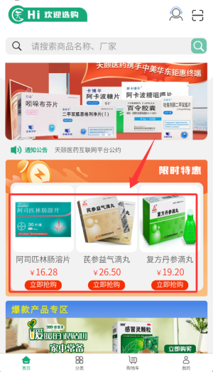 1、登录天颐医药APP后,在首页导航栏找到"限时活动"专区,点击进入查看促销商品。