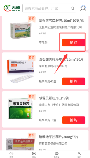 2、浏览特惠药品列表,选中所需商品后点击"抢购"按钮进入购买页面。