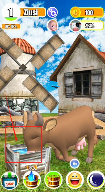 3、水槽边喝水的奶牛,水位降到50%以下记得点水槽加水。