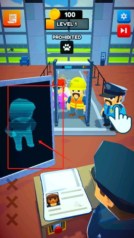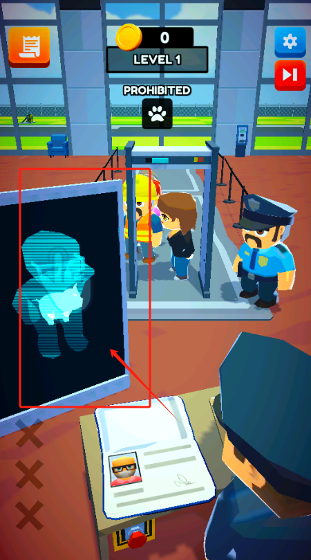 2、第一关发现行李里有小狗,点屏幕标记违禁品得分。