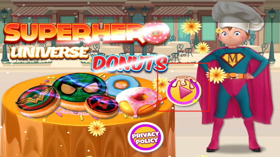 1、点播放按钮开始游戏,其他隐私政策不用管,直接玩超级英雄甜甜圈。
