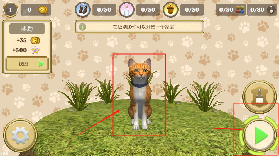 1、点右下角绿色箭头开始游戏,左上角显示等级1,完成30个任务能升级。