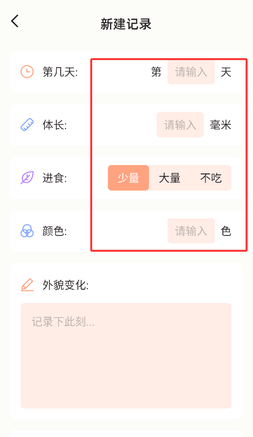 2、填写蚕宝宝生长数据,包括日龄、体长、食量、体色变化等关键生长指标。