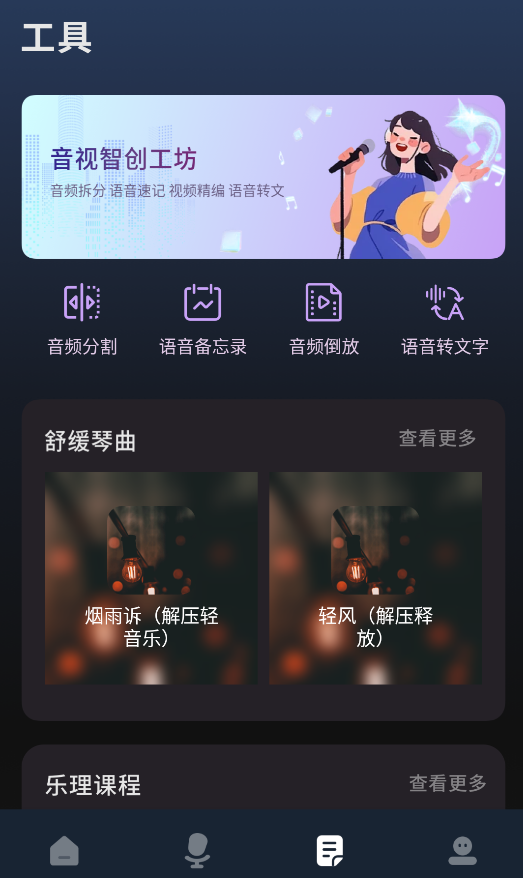 1、启动APP后,首页提供专业音频处理功能,包括背景音乐提取、多轨混音、格式转换等工具。