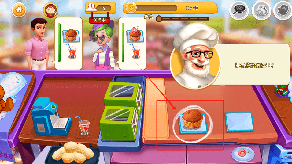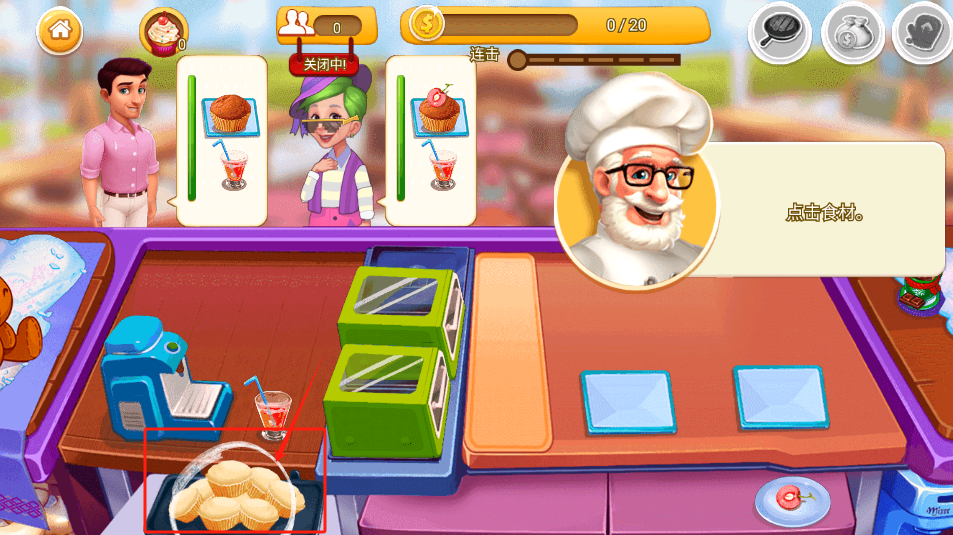 1、点松饼食材开始制作,看右上角订单,完成0/20个任务,注意连击进度条。