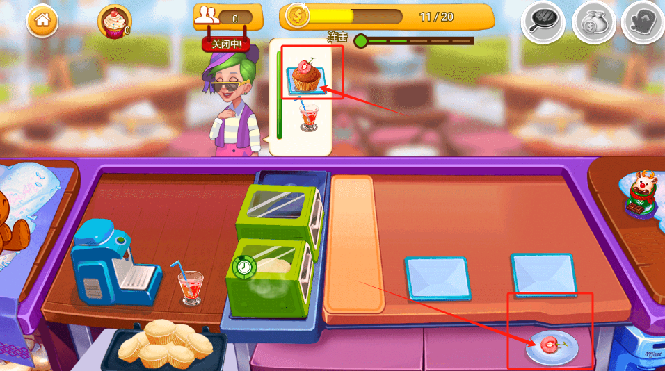 2、把做好的松饼和饮料端给顾客,柜台上有食物,任务完成11/20个。