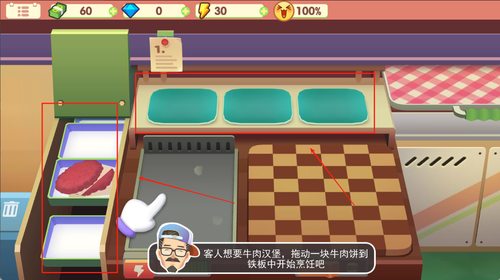 2、滑动屏幕切换厨具与食材根据订单要求快速制作料理提高满意度增强操作流畅度与客户服务意识提升收益积累速度。