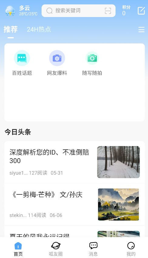 1、启动APP后,首页会推送今日头条和24小时热点资讯,用户可以随时浏览最新本地新闻和热门话题。