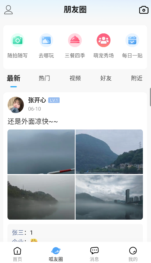 2、进入呱友圈可查看同城用户分享的生活动态,支持评论、点赞互动,还能发布自己的图文动态。