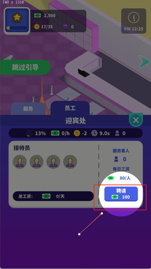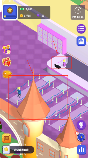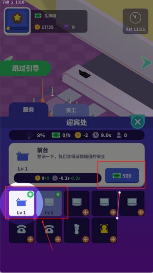 2、点击建筑进行升级或雇佣员工,拖动角色至对应岗位完成分配,提高运营效率。