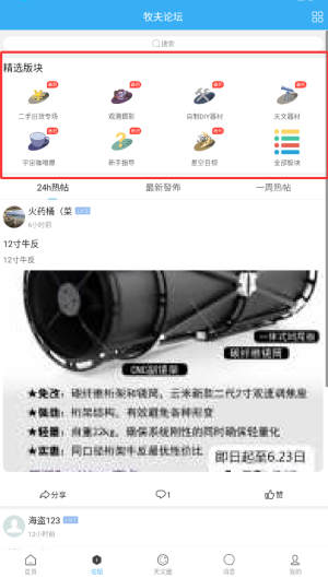 1、启动牧夫天文APP后,在底部导航栏选择"论坛"选项,即可进入天文爱好者交流社区。