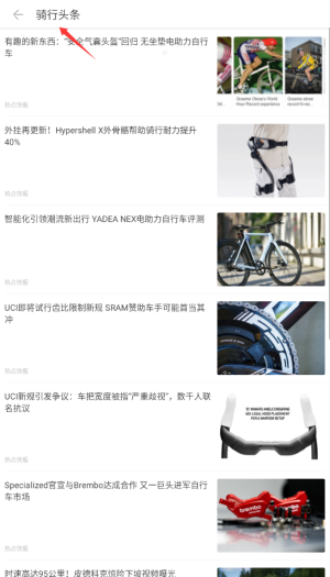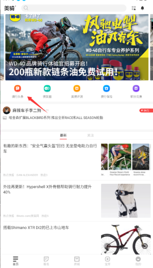 1、进入美骑APP后,在首页导航栏选择"骑行头条"栏目,这里汇集各类自行车相关资讯。
