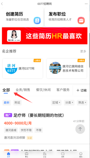 1、进入唐河0377网APP后,在首页导航栏选择"招聘求职"栏目,这里汇集本地最新岗位信息。