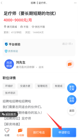 3、在职位详情页面点击"申请"按钮,即可在线投递个人简历应聘该岗位。
