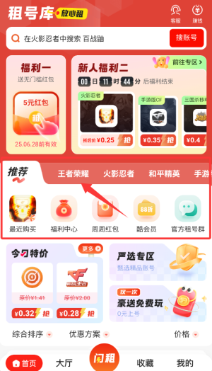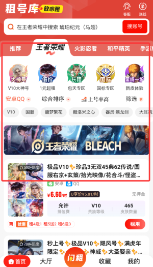 1、进入租号库APP后,在首页游戏分类中选择目标游戏专区,查看可租账号。