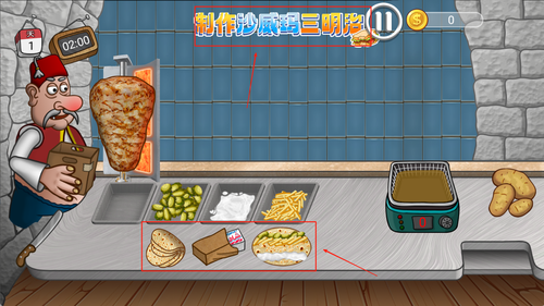 2、点击食材区域选择所需肉类、蔬菜与酱料,按照提示完成切配、烘烤与卷饼操作。