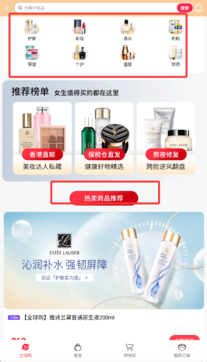 1、启动易佳购APP后,在首页点击"全球购"分类,进入跨境商品选购页面。