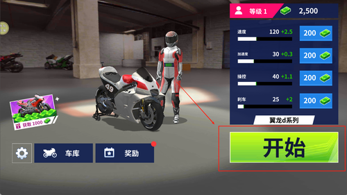 2、选择适合自己的摩托车进行比赛,每辆车都有专属属性和外观,通过升级强化提升性能以适应更高难度挑战。
