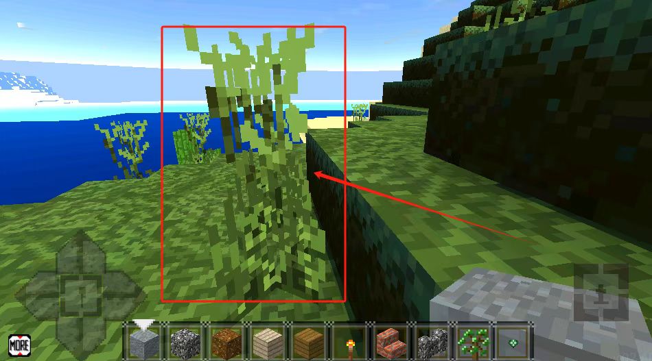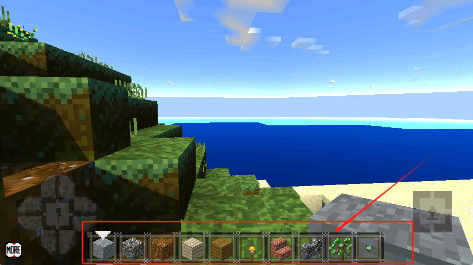 2、选物品栏里的方块,点绿山坡建造房子,注意右下角箭头指的材料。
