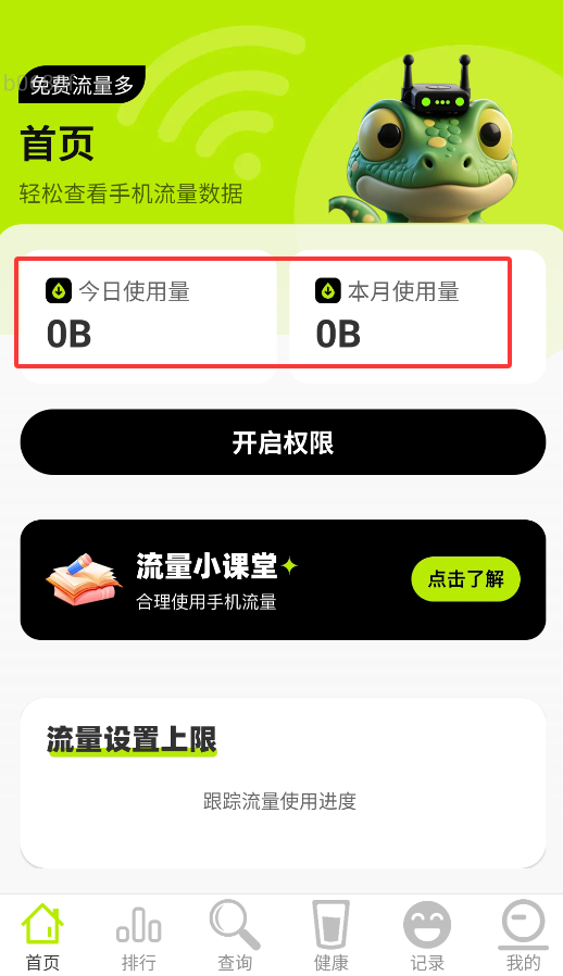 1、打开应用后,首页顶部实时显示当日已用流量和本月剩余流量(精确到MB),流量不足时会弹出充值提醒弹窗。