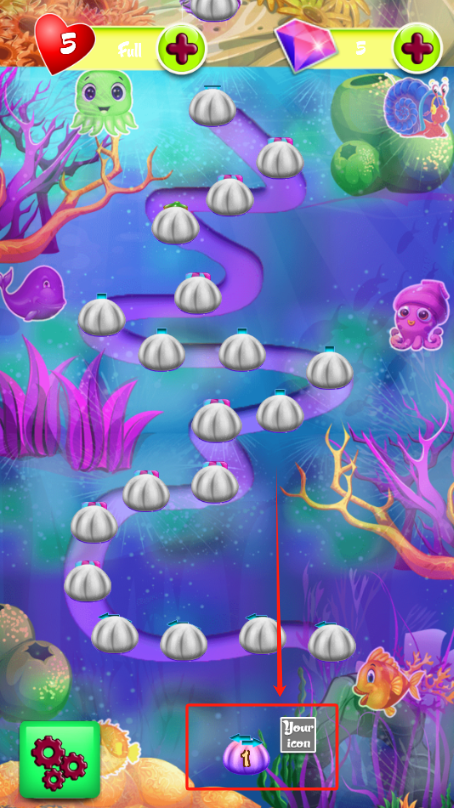 2、左上角显示5颗爱心,右上角有5个宝石,底部红框是玩家图标。