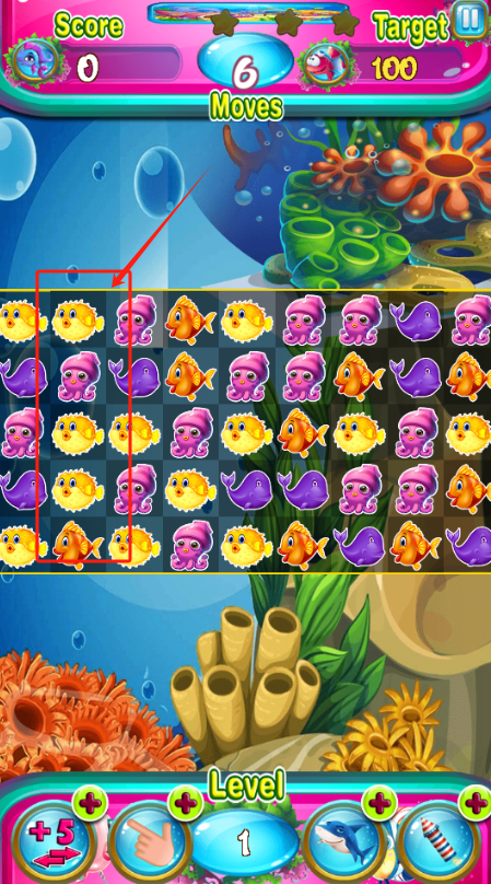 3、消除小鱼赚分数,目标100分,还剩6步,左下角有+5和手套道具。