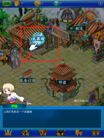 2、按红框里的武器铺买第一个建筑,手指提示要买这个。