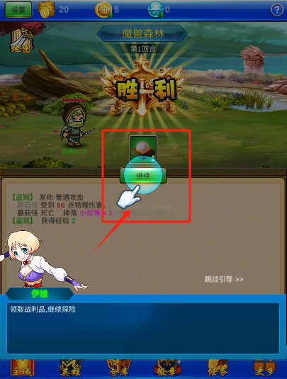 3、战斗赢了,点红框继续按钮,下面显示掉了小珍珠。
