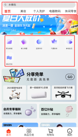 1、进入汽震商城APP后,浏览首页商品分类,点击感兴趣的商品类别进入详情页。