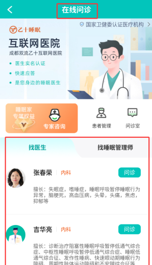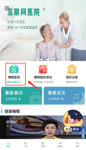 1、启动乙十睡眠APP后,在首页选择"睡眠医院"功能模块,进入专业医师咨询平台。