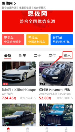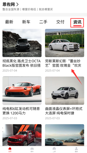 1、进入恩佐网APP后,在首页导航栏点击"资讯"选项,进入汽车信息专区。