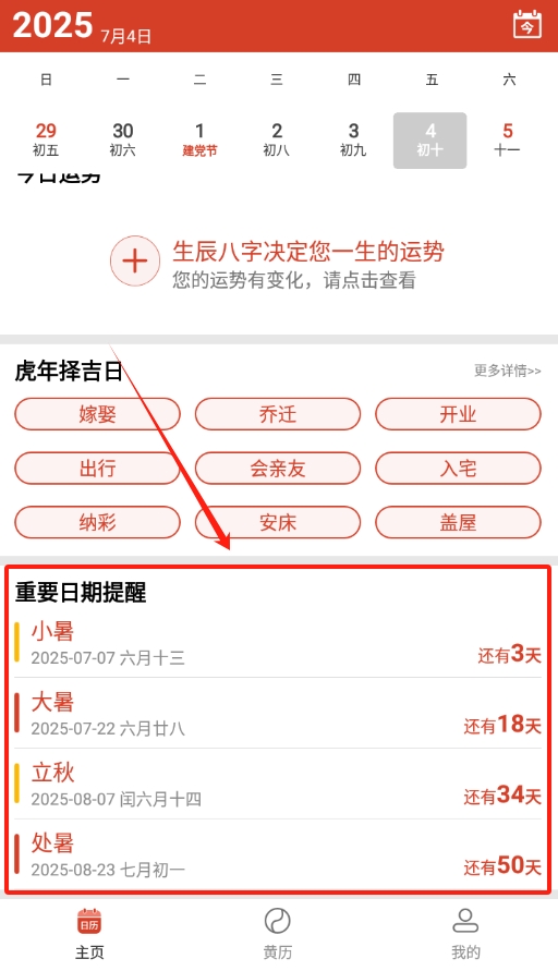 2、基础日历信息查看:进入首页即可查看日历界面,标红日期清晰显示各类节假日或特殊日子。