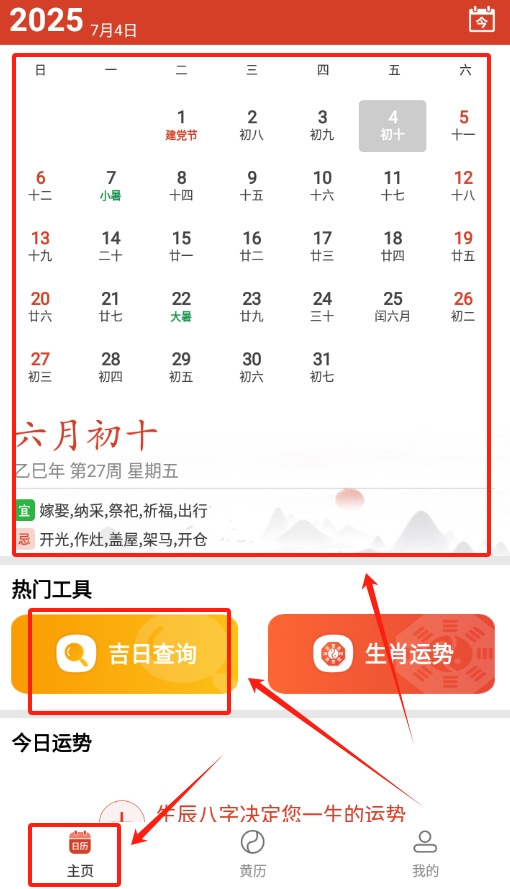 3、黄历信息详细查询:点击 “黄历” 板块,全面查看当日吉日、宜忌等传统历法相关内容信息。