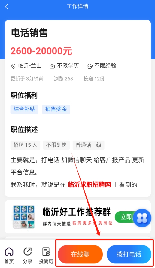 3、要是觉得该职位适合自己,在岗位详情页面底部,按需点击在线聊与拨打电话选项,就能和招聘方沟通 。