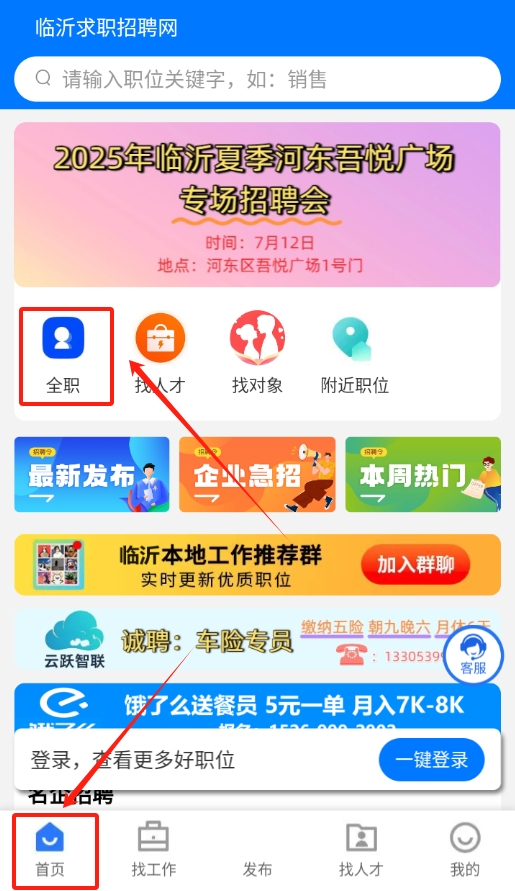 1、打开临沂求职招聘网,进入软件首页,在显眼位置找到 “全职” 选项,点击它。