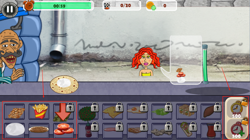 2、左侧是食材准备区域,右侧为出餐窗口和订单查看界面,合理安排顺序才能按时完成出餐服务。