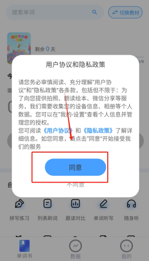 1、首次启动应用时,用户需在界面底部轻触同意按钮,将自动跳转至功能完善的学习主界面。