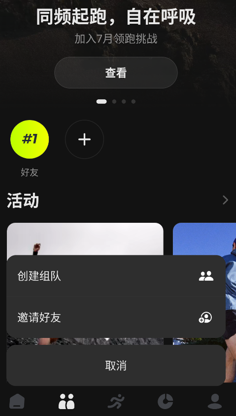 2、进入活动页面,既可报名参加官方组织的跑步赛事,也能创建私人跑团邀请好友组队参与。