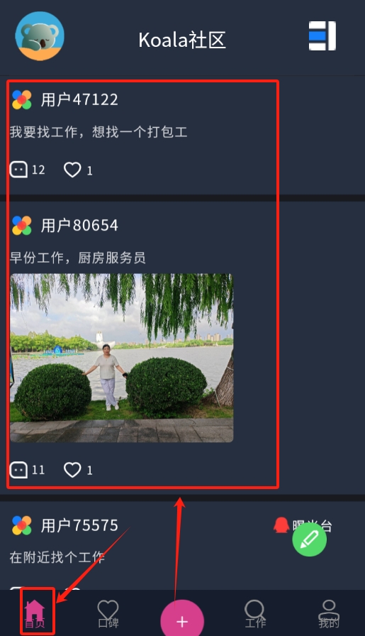 3、登录成功后返回首页,就可以浏览查看各种找工作的帖子信息了。