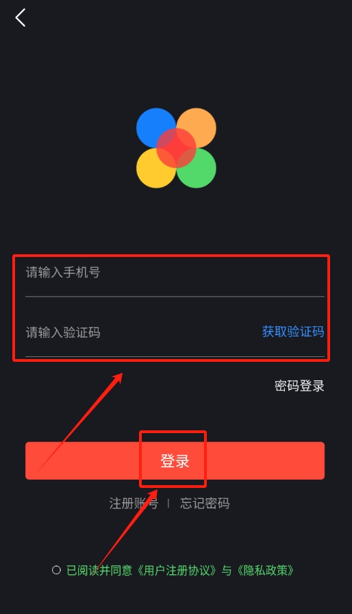 2、在登录页面输入手机号,获取并输入验证码,完成账号的登录流程。