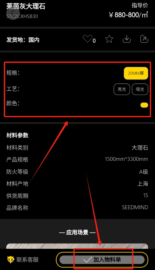 3、规格都选好确认无误,直接点击 “加入物料单”,轻松把需要的材料先存起来。