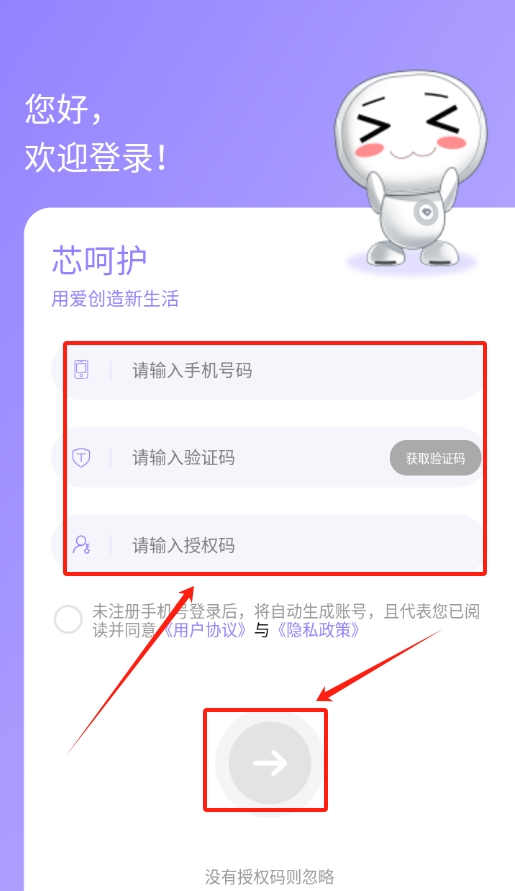 3、在登录页面输入手机号,获取验证码并输入,再填授权码就能登录了。