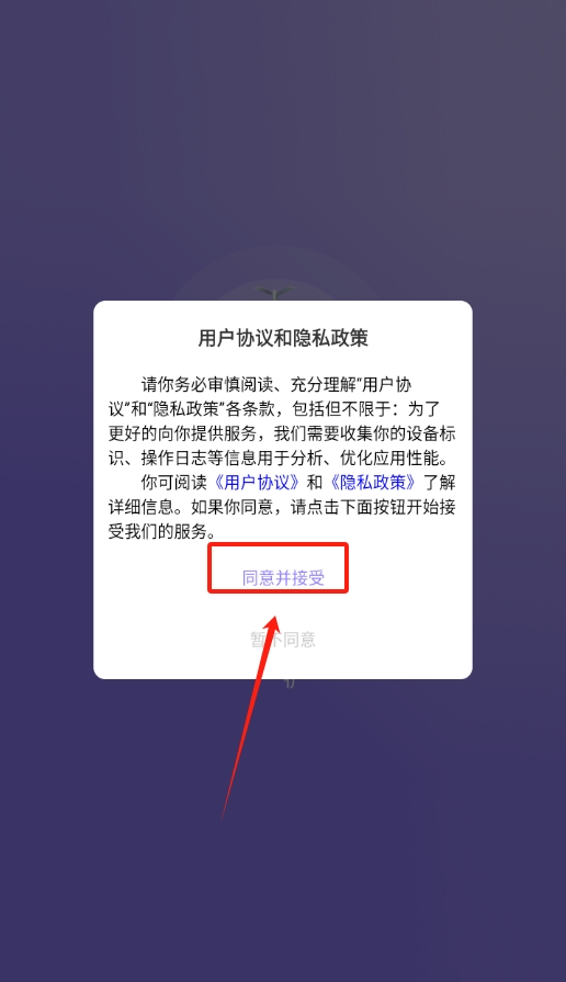 2、打开后看到用户协议,点击同意才能继续使用软件。