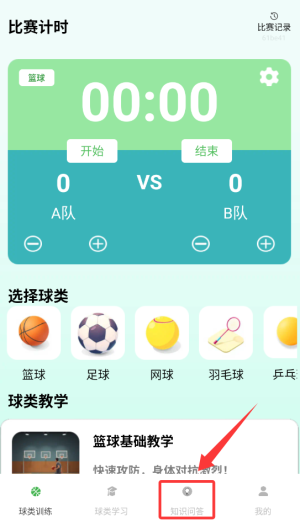 1、启动全能球场APP后,在首页导航栏中找到并点击"知识问答"功能入口。