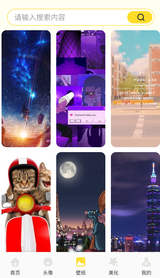 1、智能分类检索:支持按颜色、风格、关键词等多维度搜索。独创"以图搜图"功能,上传图片即可找到相似风格壁纸。