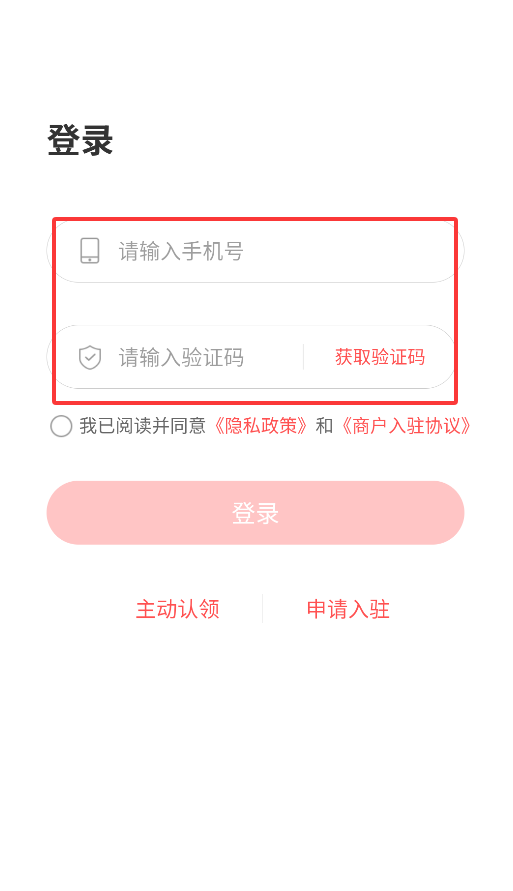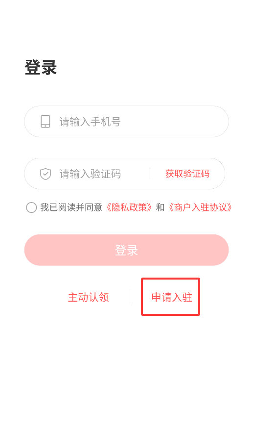 1、打开APP后,在登录页面下方找到"商家入驻"入口,点击进入申请流程。