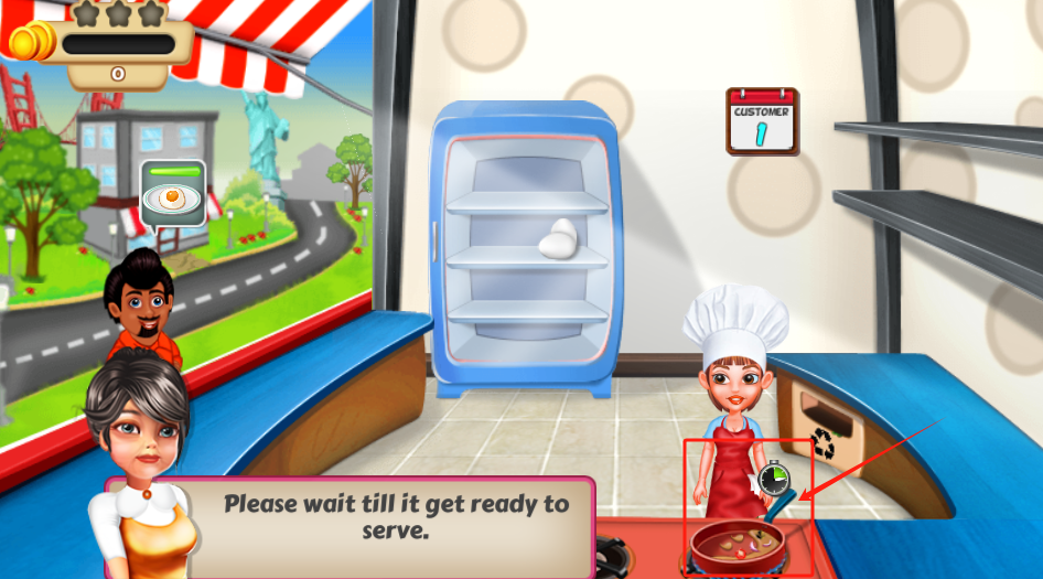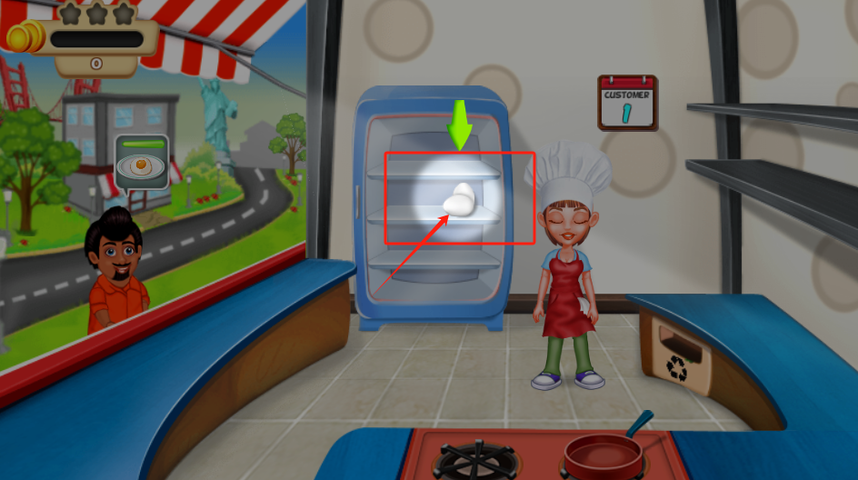 2、开冰箱拿食材,给顾客做菜,别让星星数变零。
