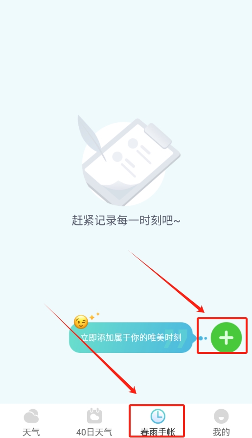 3、想写手账记录生活,在春雨手账页面右下角找到加号,点开就能开始写啦。