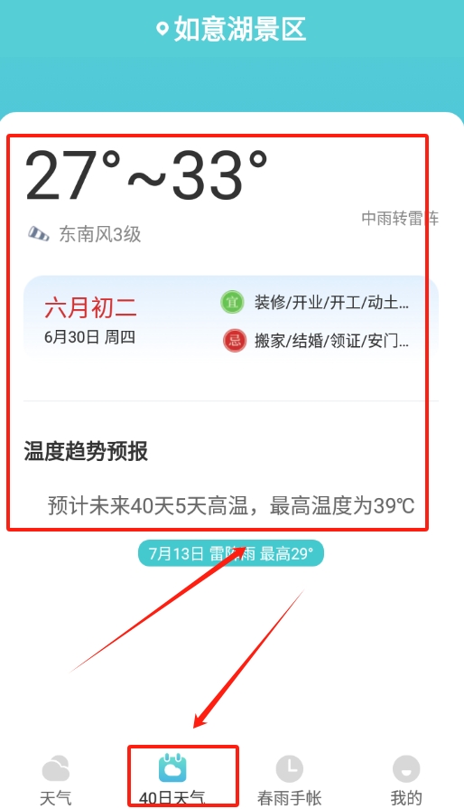2、想知道未来40天的天气,点进 “40日天气” 页面,早做计划心里更有底。